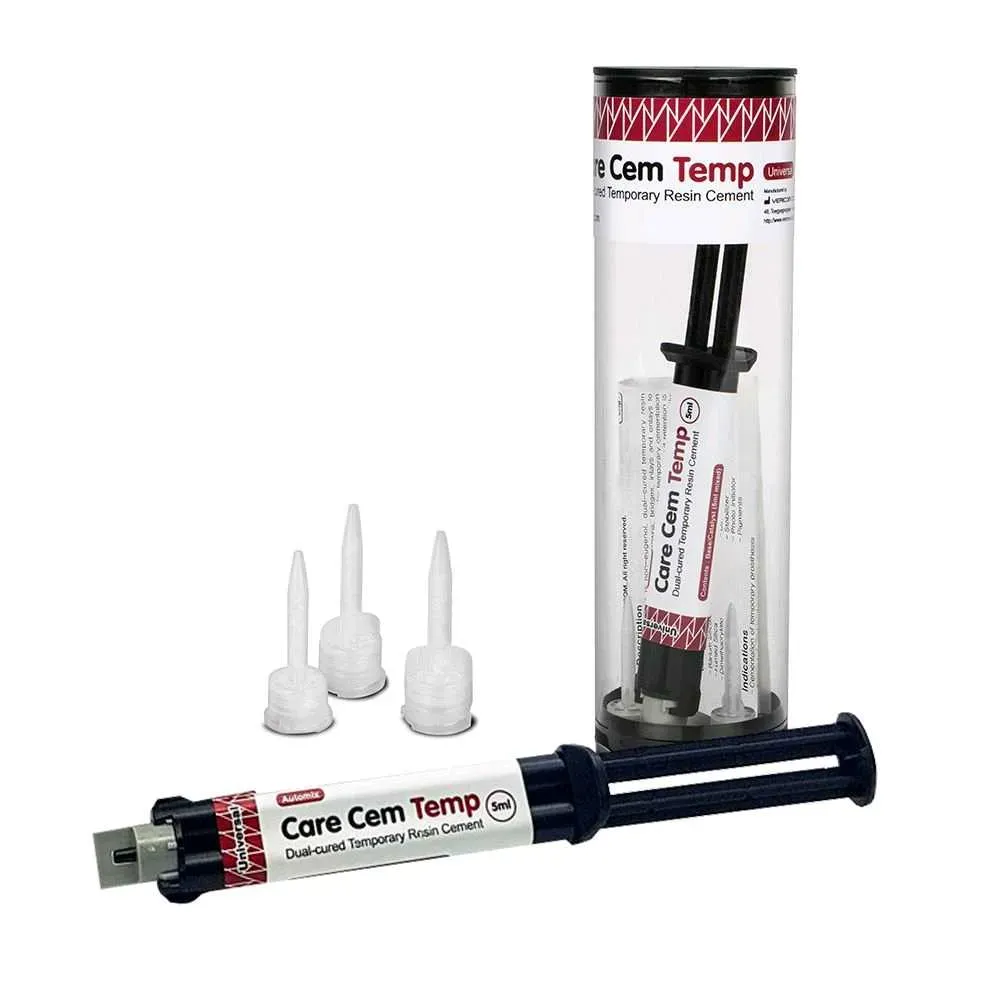 Care Cem Temp es un cemento de resina temporal de curado dual, sin eugenol, diseñado para la fijación segura de coronas, puentes, incrustaciones y onlays temporales a dientes y pilares de implantes. Ideal para la cementación temporal de restauraciones provisionales que requieren retención prolongada...