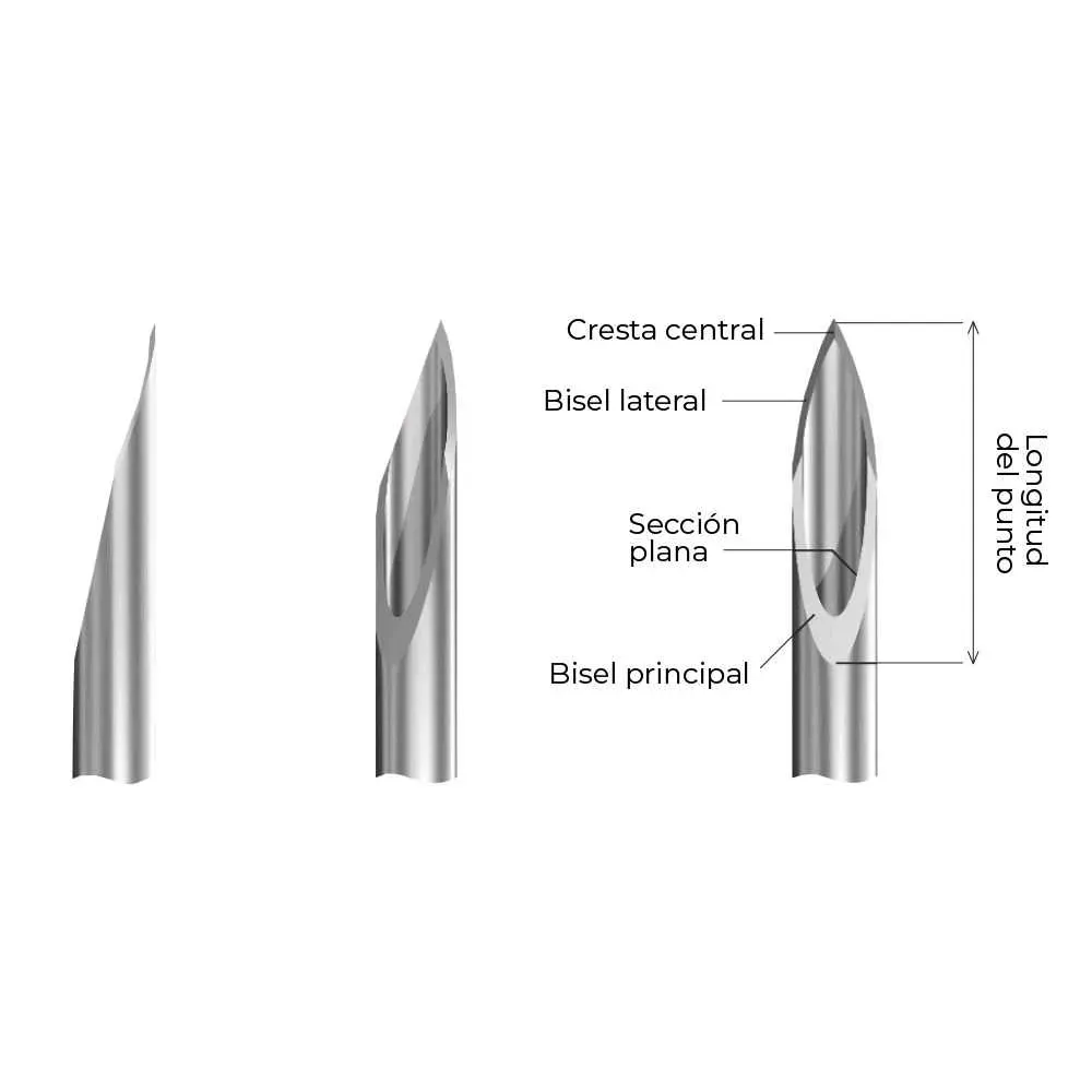 Punta de triple bisel que facilita la penetración en el tejido sin perforarlo, protegiendo la encía