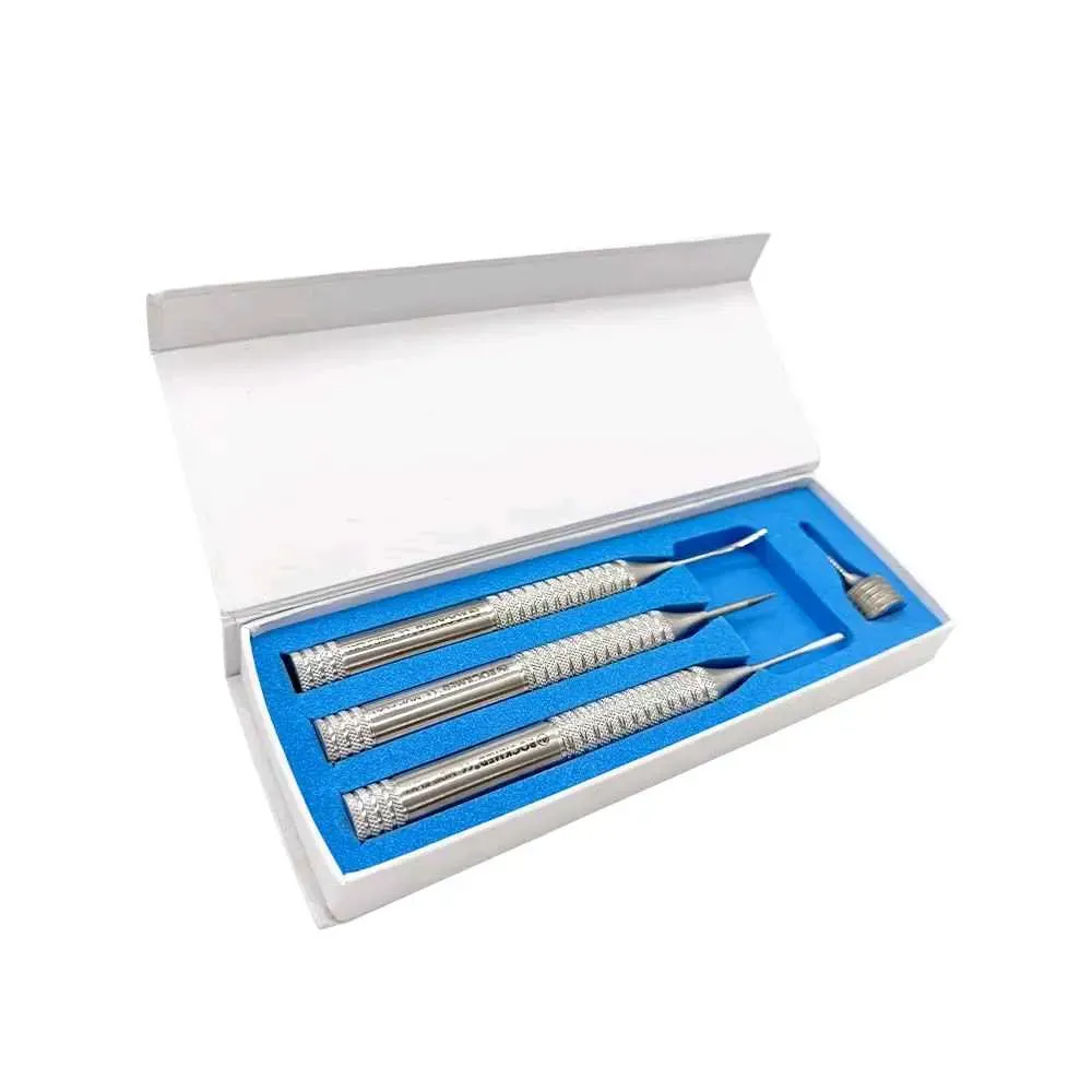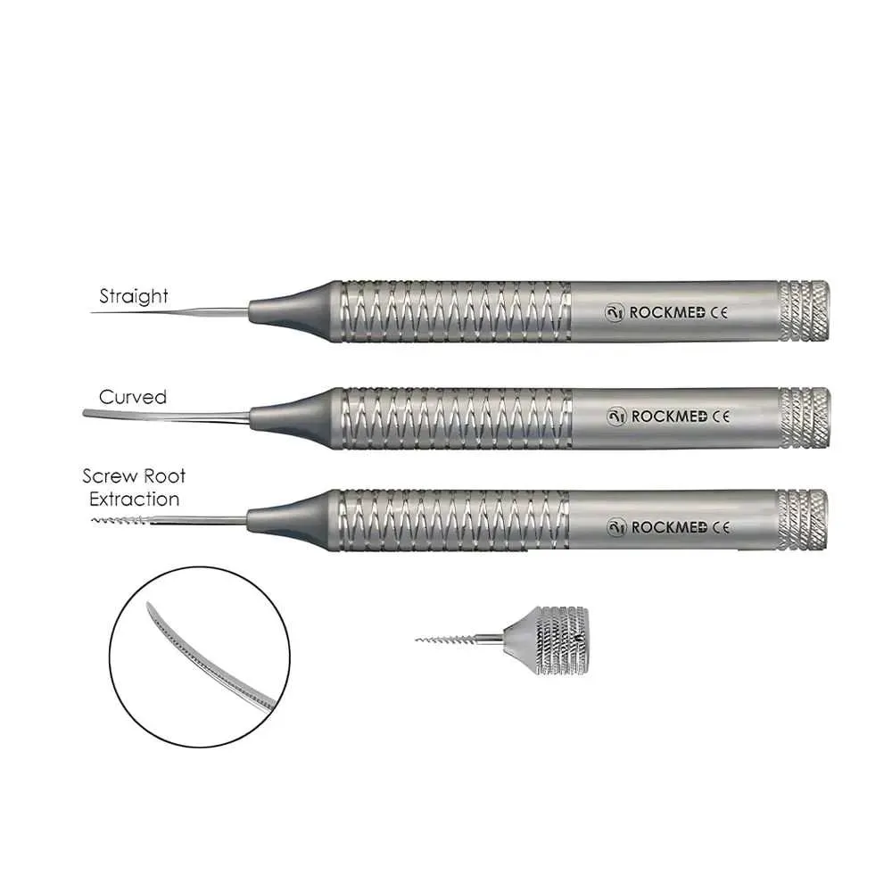 Incluye 3 periotomos flexibles y un extractor de raíces con mango corto