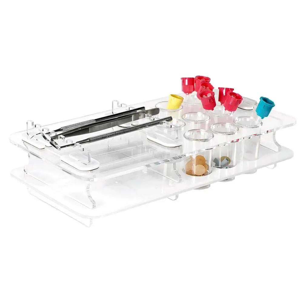 Objeto funcional y de diseño utilizado para múltiples usos en odontología, medicina, estética, etc. Creado para alojar materiales e instrumental para operatoria (piedras de diamantes, cuñas de plástico, gomas intraorales, pinzas, etc.), sin embargo el usuario puede darle múltiples aplicaciones para ...