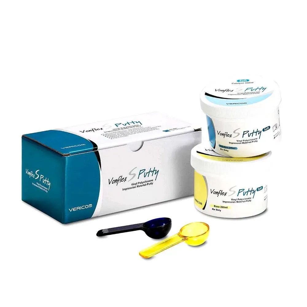 Vonflex S Putty es una silicona de polimerización por adición compuesta de vinil polisiloxano que ayuda a crear una forma precisa del tejido bucal. Este material es fácil de mezclar y ofrece una excelente estabilidad dimensional, asegurando impresiones precisas y libres de burbujas de aire.